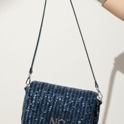 Bandolera mediana NOCO diseñada en tejido vaquero denim con incrustaciones cosidas de lentejuelas, un material elegante y muy especial que aporta brillo sutil y personalidad al diseño. La combinación del denim con los detalles en piel sintética en tono plateado crea un contraste moderno y sofisticado, perfecto para elevar cualquier look.