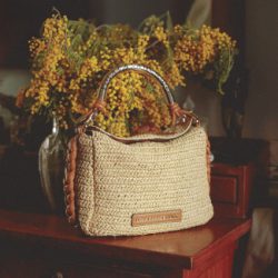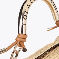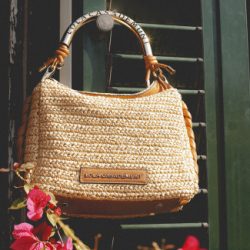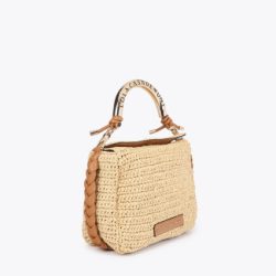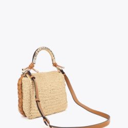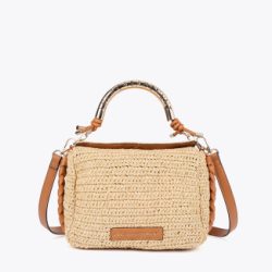 Elegante bandolera de diseño estival con efecto rafia y asa troquelada metálica con logo. Confeccionada en materiales de alta calidad, cuenta con un cierre magnético y correa ajustable de piel sintética trenzada.