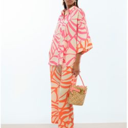 Camisa fresca con diseño de hojas en tonos vibrantes. Mangas caídas para un look desenfadado, ideal para verano. Tejido ligero y cómodo.
