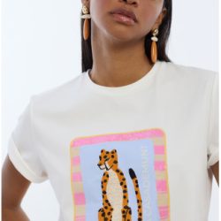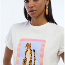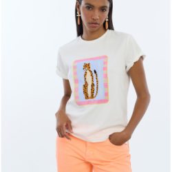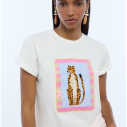 Camiseta blanca de manga corta con un diseño exclusivo de animal bordado y lentejuelas transparentes. Suave al tacto y cómoda para cualquier ocasión. Ideal para añadir un toque de originalidad a tu atuendo casual.