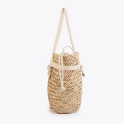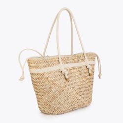 Capazo de verano ideal, elaborado en material natural con asas robustas y detalles de efecto piel. Incluye cierre ajustable y un logo dorado que aporta un toque de lujo a su diseño casual. Amplio espacio interior.