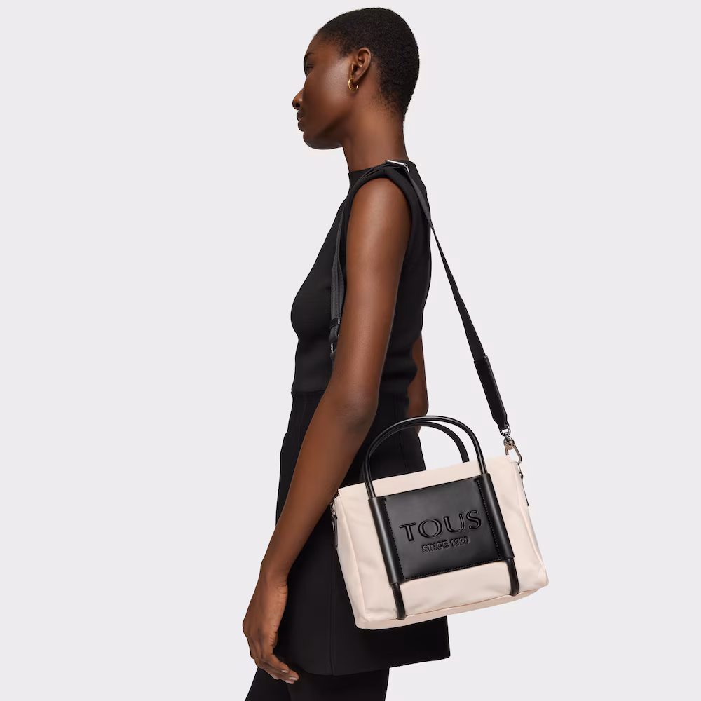 Bolso city mediano de la colección Empire Soft de nylon reciclado en color nude. Cierre con cremallera. Asas de mano y correa larga ajustable y extraíble. Bolso cuenta con 2 bolsillos exteriores planos. Medidas: 10,5 x 31,5 x 20 cm.