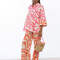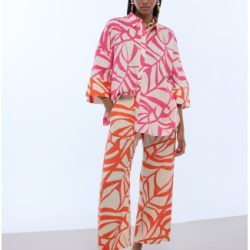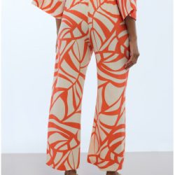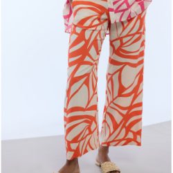 Pantalón culotte en tejido ligero con estampado de hojas en tonos vibrantes. Diseño de cintura elástica para mayor comodidad y corte amplio que favorece la silueta. Perfecto para un look veraniego relajado.