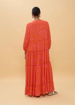 Vestido largo con estampado de manchas en tonos vivos. Confeccionado en tejido fluido y ligero. Presenta mangas largas, escote profundo y corte holgado, ideal para un look bohemio y elegante.